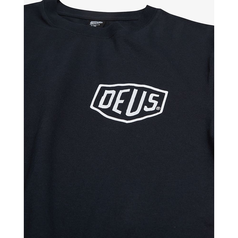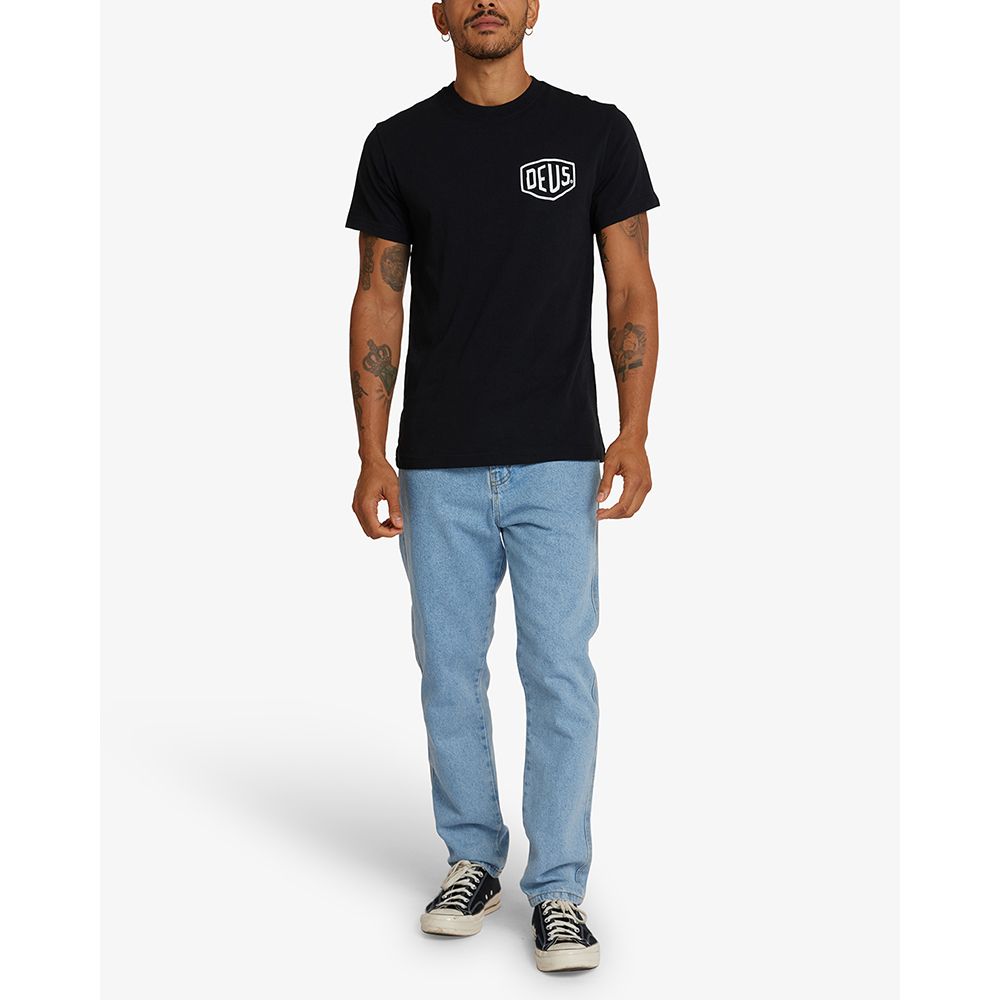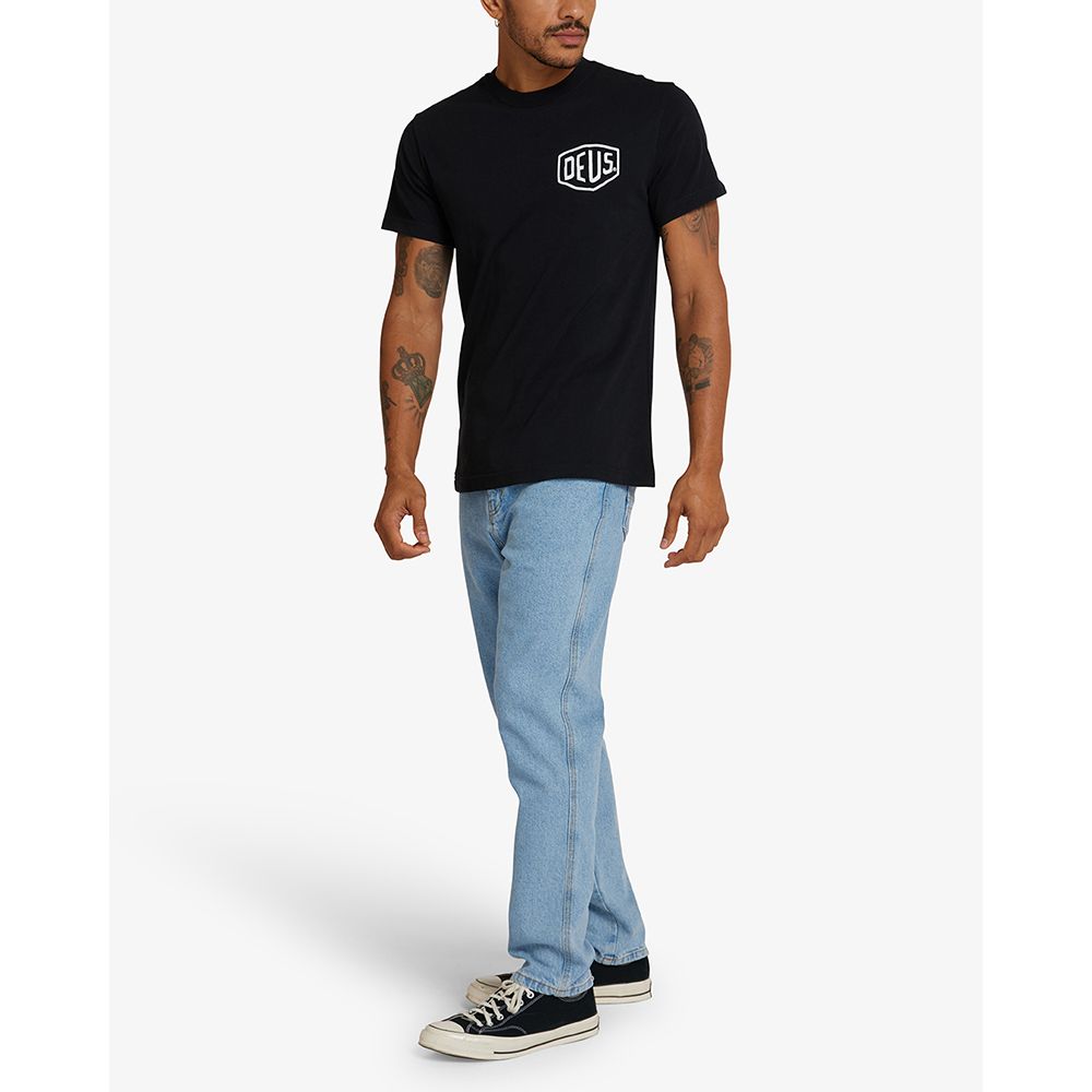 Esta camiseta negra de corte regular para hombre presenta un estampado original de Deus en el panel delantero y trasero sobre un jersey de algodón suave de 20/1s y 190 g/m².