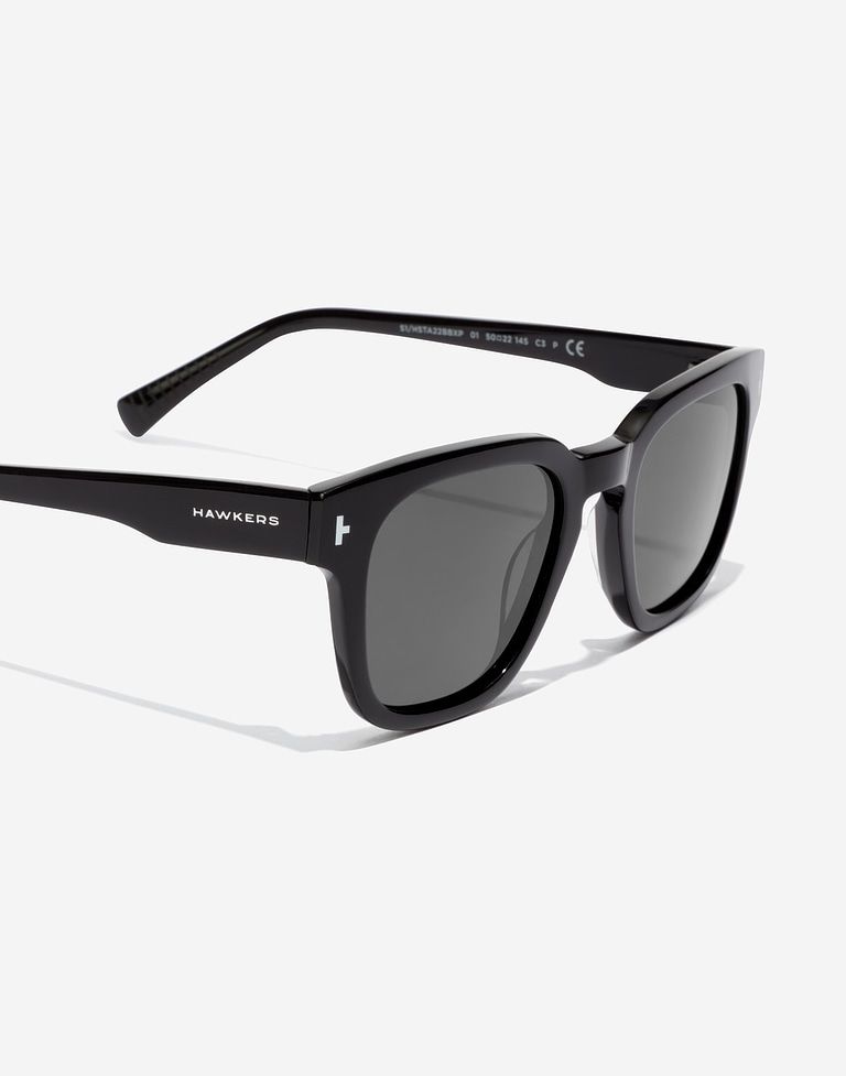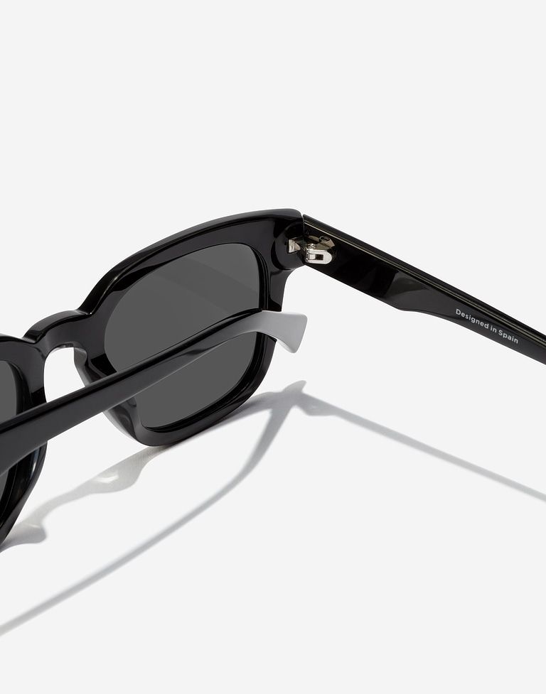 Gafas de sol rectangulares con diseño atemporal. Con acabado brillante, lentes polarizadas negras y almohadillas de acetato que proporcionan mayor comodidad. La montura color negro en acetato tiene un grosor especialmente notable dándole a este diseño un toque retro.